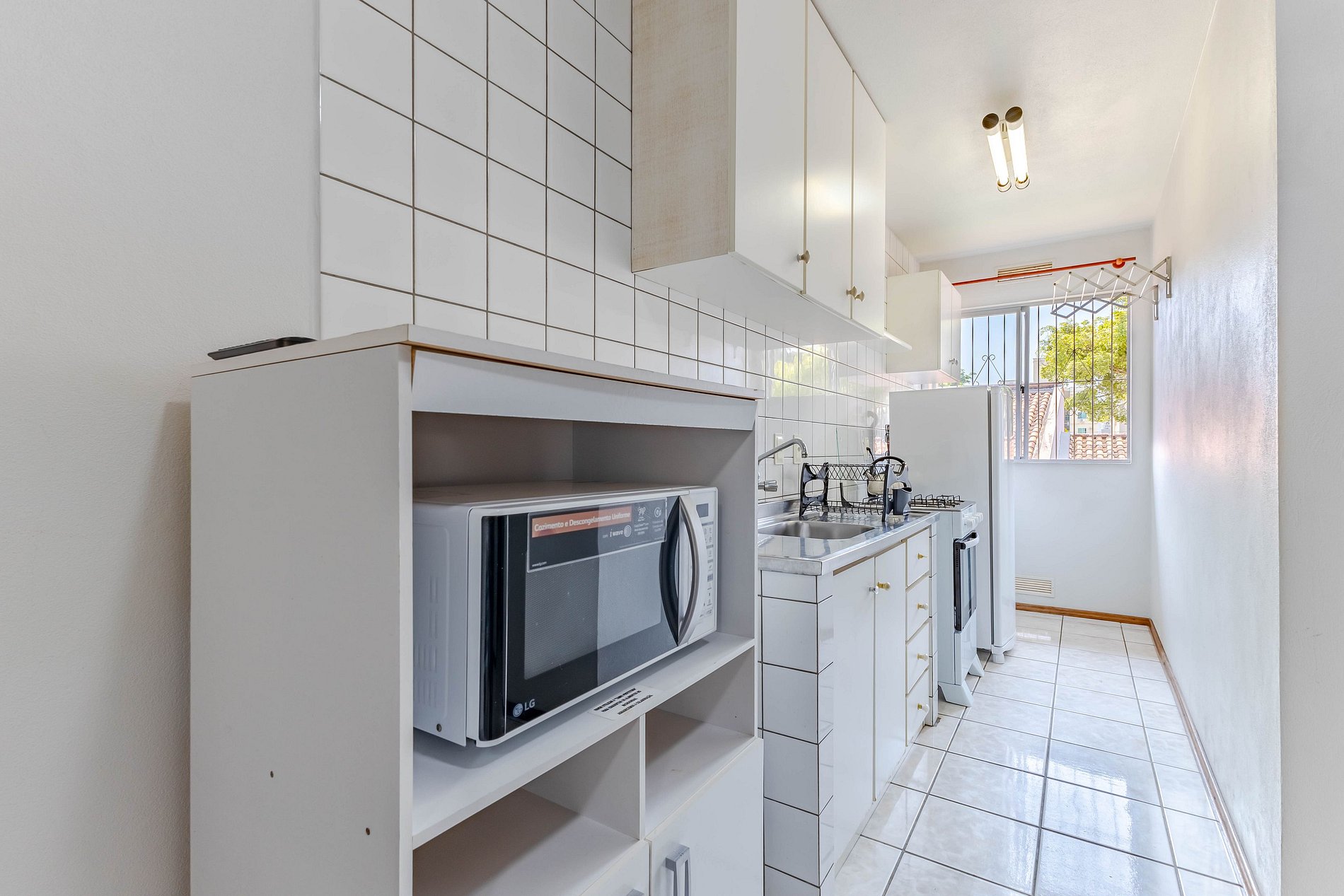 A cozinha possui fogão à gás com 4 queimadores, forno è gás embutido no fogão, pia, microondas, geladeira, panelas, louças e talheres para até 6 pessoas. Integrado à cozinha há área de serviço com tanque para lavar roupas.