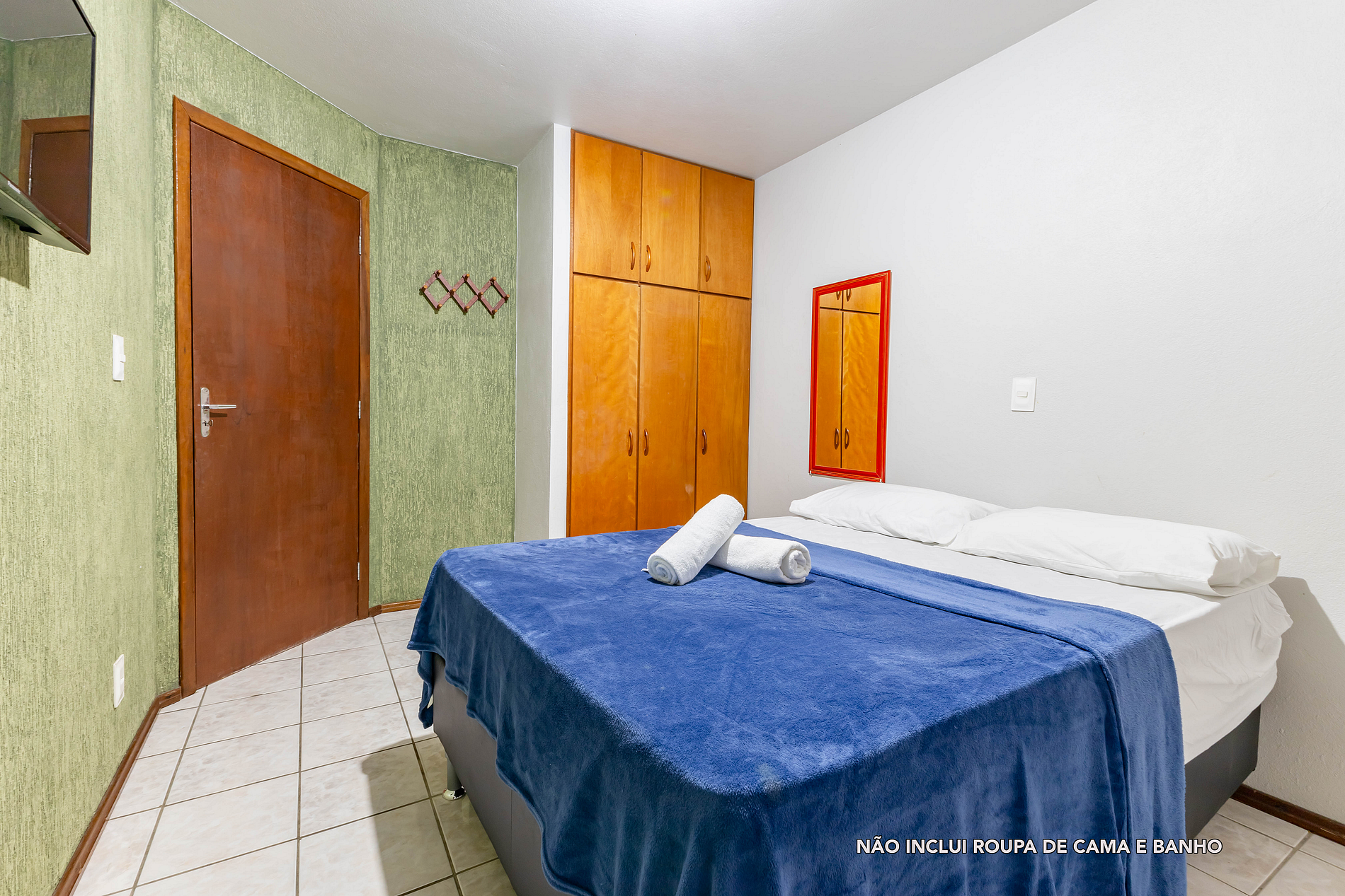 Possuímos apartamentos para até 6 pessoas, com 1 dormitório (com 1 cama de casal e 1 cama auxiliar de solteiro, com ar condicionado e tv lcd) e 1 dormitório (com 2 camas de solteiro e 1 cama auxiliar de solteiro), sala e cozinha conjugada com tv, banheiro e sacada. Não oferecemos roupa de cama e banho.
